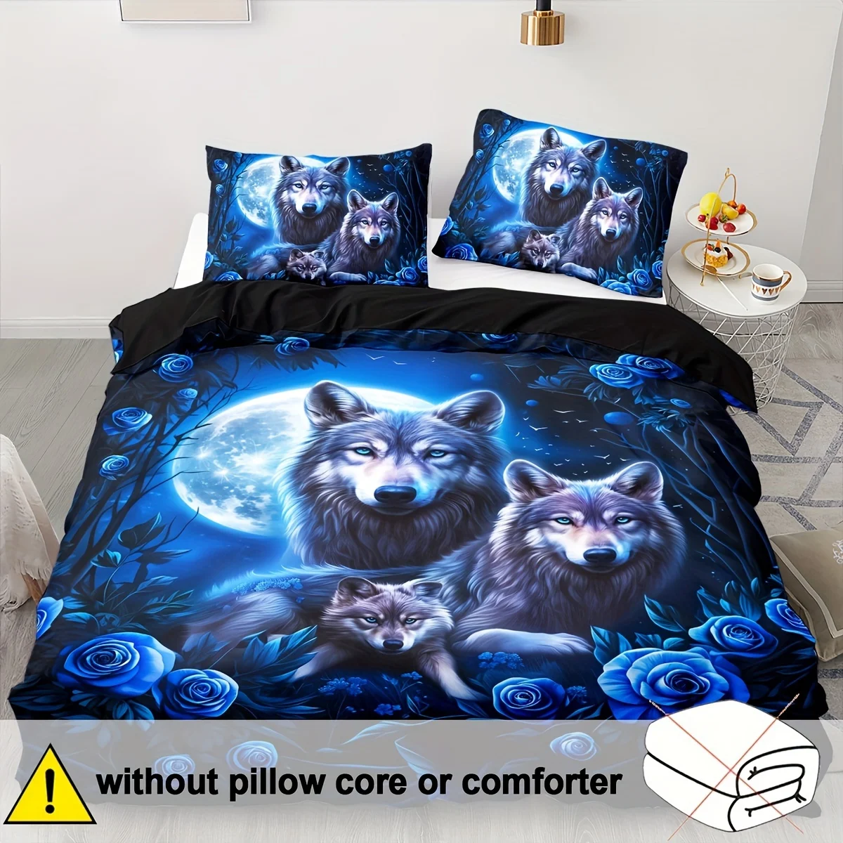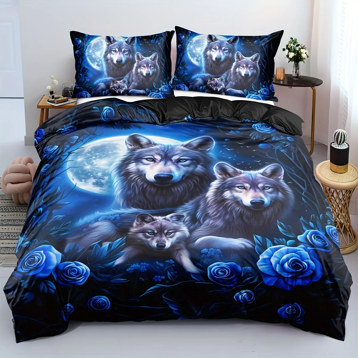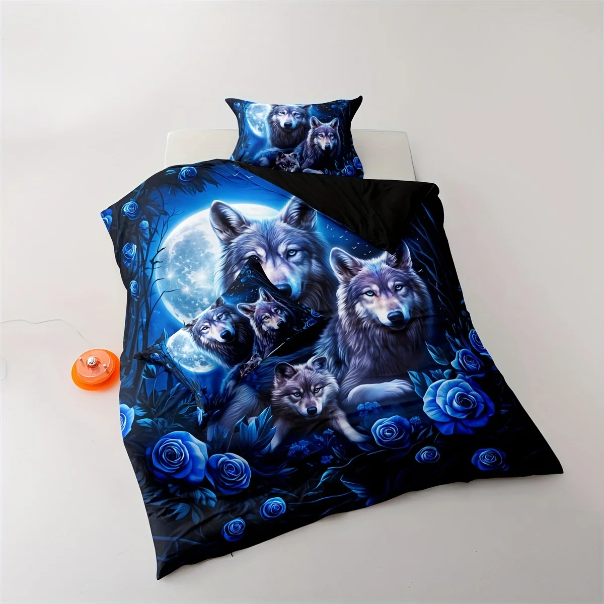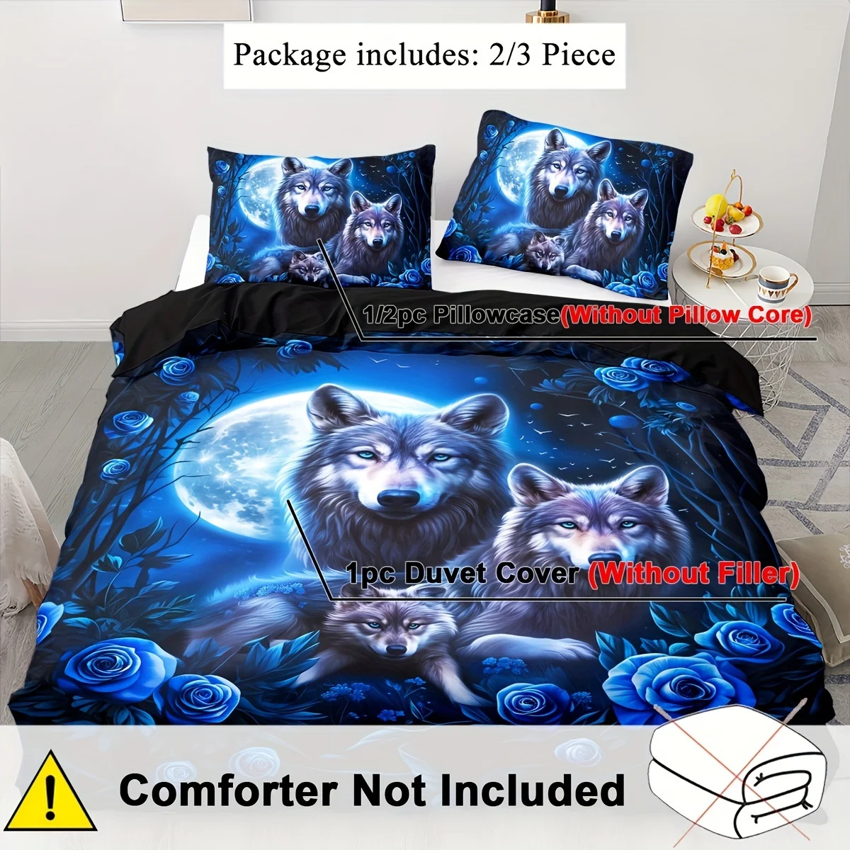 2/3pcs Soft Comfortable Duvet Cover, Wolf bedding set Set, Blue Flower Bedding set, Wolves Animal Print Floral Duvet cover
