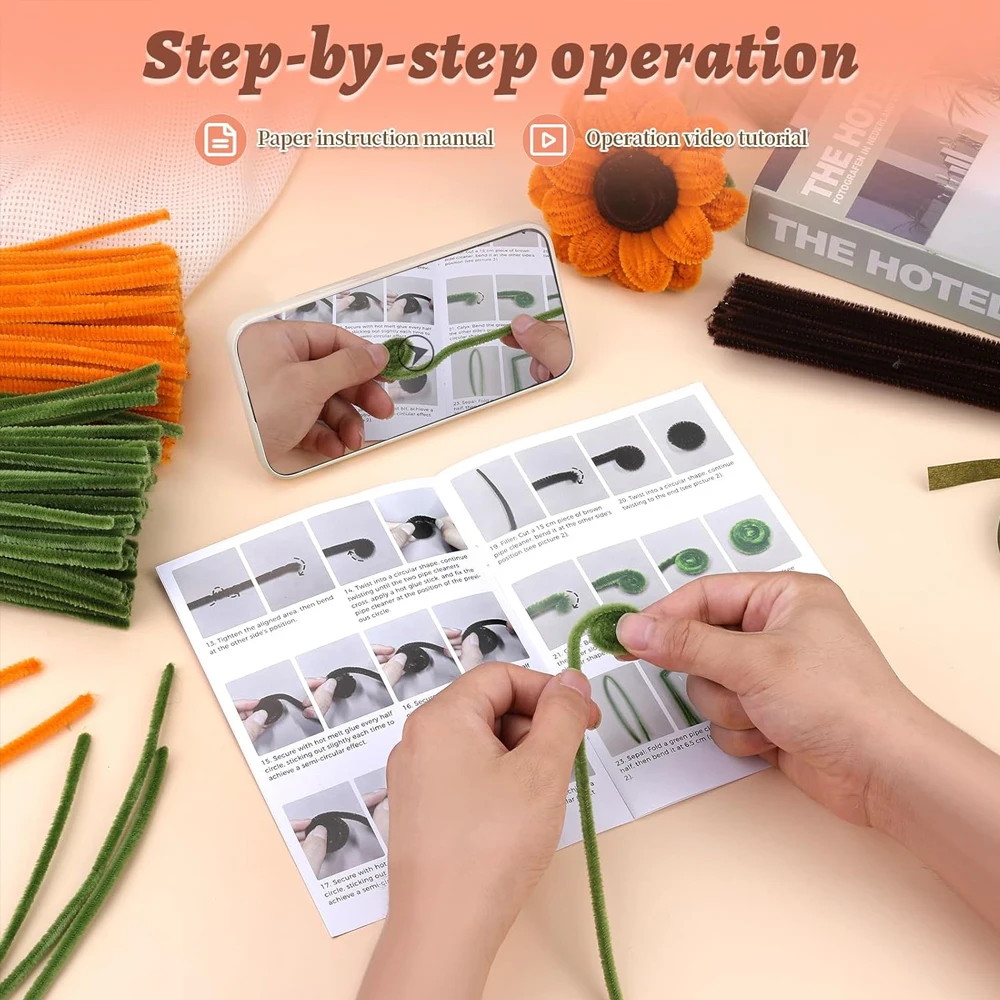 This sunflower pipe cleaner kit comes with detailed instructions. One is the sunflower production tutorial, and the other is the stem and leaf tutorial. With the help of the instructions, you can easily complete this sunflower bouquet.