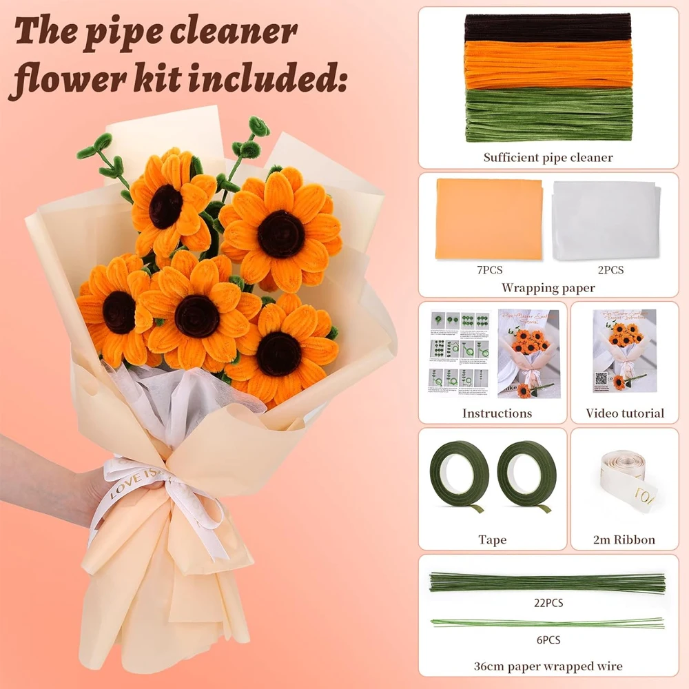 You will receive 280 pcs of pipe cleaners (100 pcs yellow, 150 pcs green, and 30 pcs brown), 28 pieces of floral wire (6pcs 22 gauge, 22pcs18 gauge), 9pcs bouquet wrapping paper, 2pcs bouquet tape, 2 meters of ribbon, and instruction.